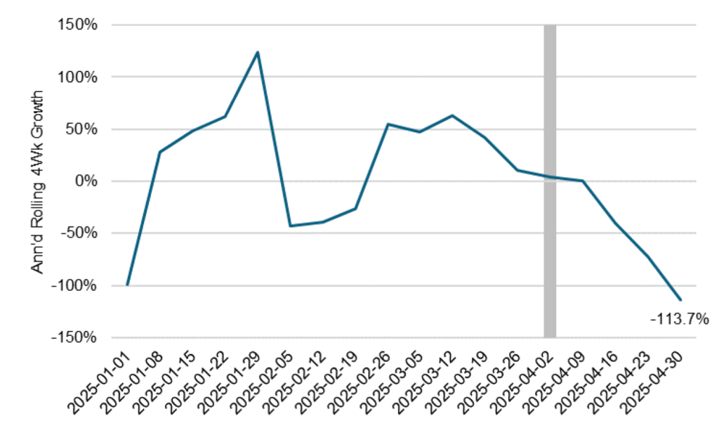 The market closed on Friday pricing fed funds at 3.81% to end the year, less than 7 bp below the Fed’s March dots. The steady reversal over the last few weeks of market expectations for cuts this year likely reflects a series of messages from Fed speakers about the risk of inflation from tariffs. The Fed looks prepared to wait until it has a better view of whether tariffs will bring a 1-time price change or more persistent inflation.