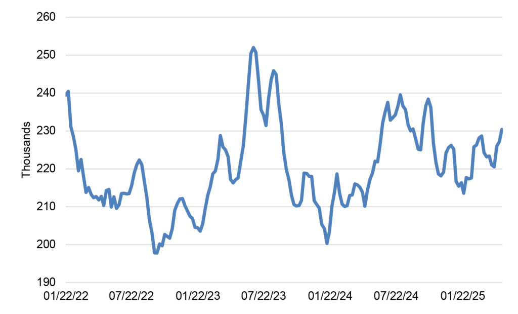 After unprecedented figures in the early days of the pandemic, when they spiked into the millions a week for several months, initial claims settled into a relatively narrow range as the economy fully reopened. Looking at the 4-week average of initial claims going back to early 2022, the scale is incredibly narrow (Exhibit 1). The series has spanned a range of barely more than 50,000 from top to bottom and has spent most of the past four years between 210,000 and 230,000.