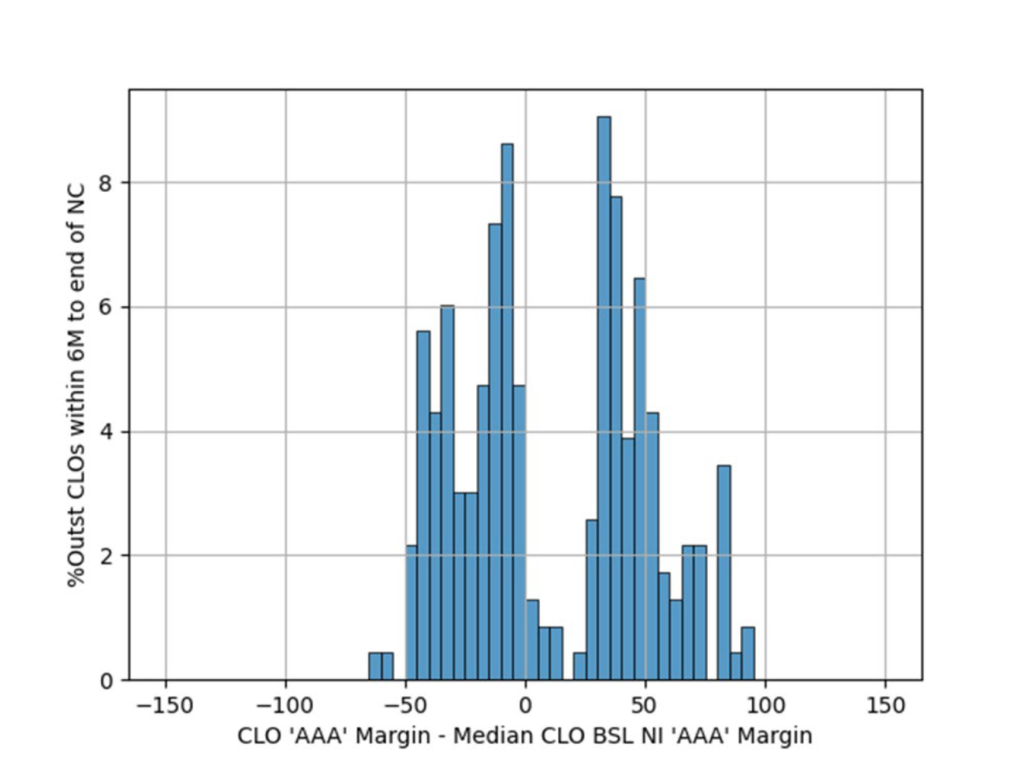 Refi risk falls again: Of 232 CLOs with six months or less to first call, the share with margins at or above the NI ‘AAA’ DM drops from 64% to 50%