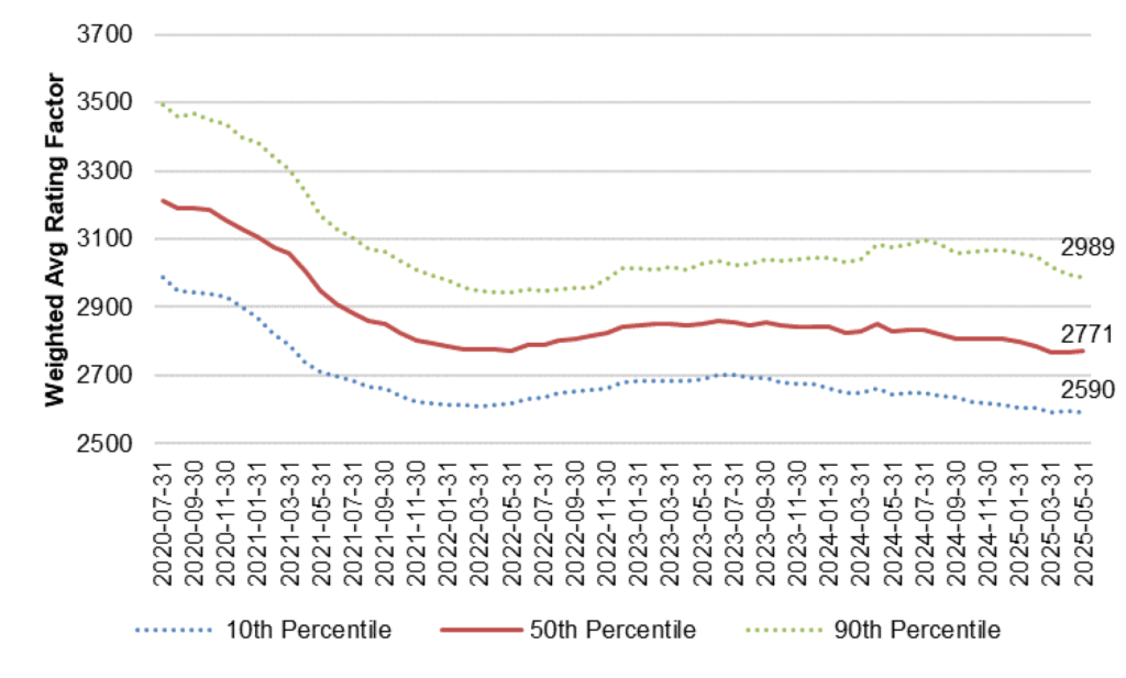 Credit: The median WARF across deals rises Apr-to-May by 2 points, 10th ptile slides 7 points, the 90th ptile slides 6 points