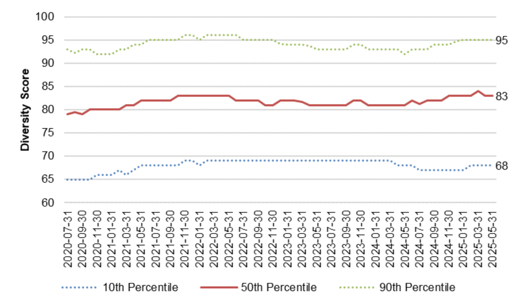 Note: The widest percentile rank is 100, the median is 50 and the tightest is 0. Data show DM to SOFR.