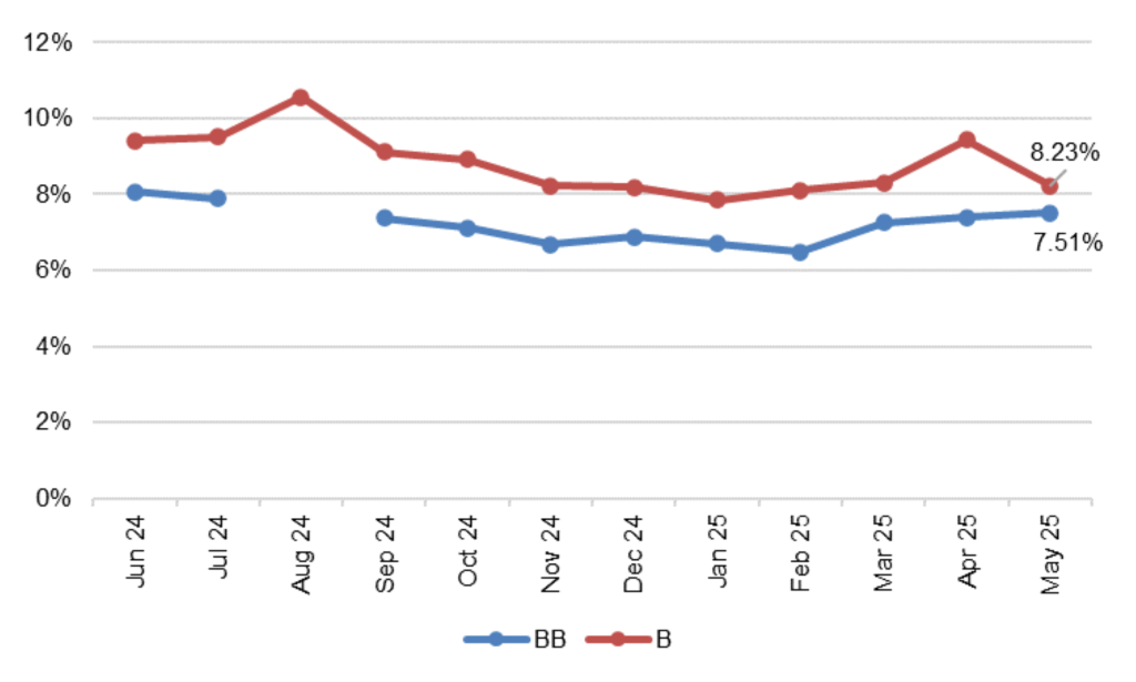 Rolling 90-day yields on new ‘B’ loans drop Apr-to-May by 121 bp as ‘BB’ rise 11 bp