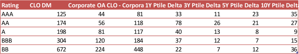 CLOs tighten to corporates, ending modestly tight to the 1Y range and very tight to longer horizons
