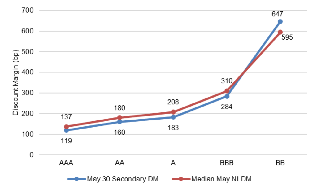 Average outstanding ‘AAA’ spreads tighten by 15 bp in May, ‘AA’ by 21 bp, ‘A’ by 32 bp, ‘BBB’ by 55 bp and ‘BBB’ by 101 bp
