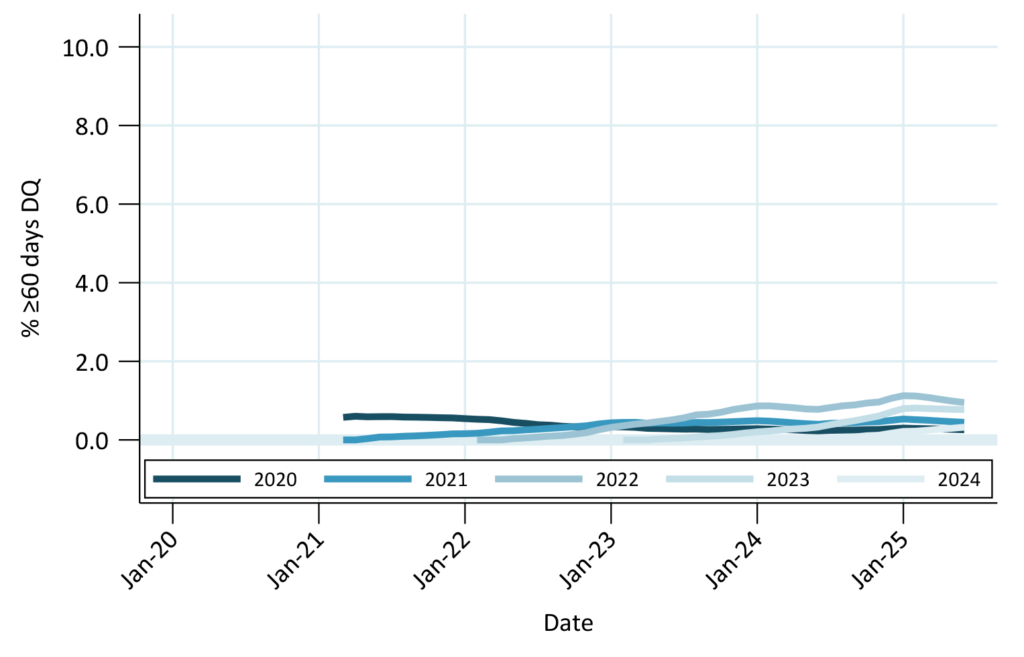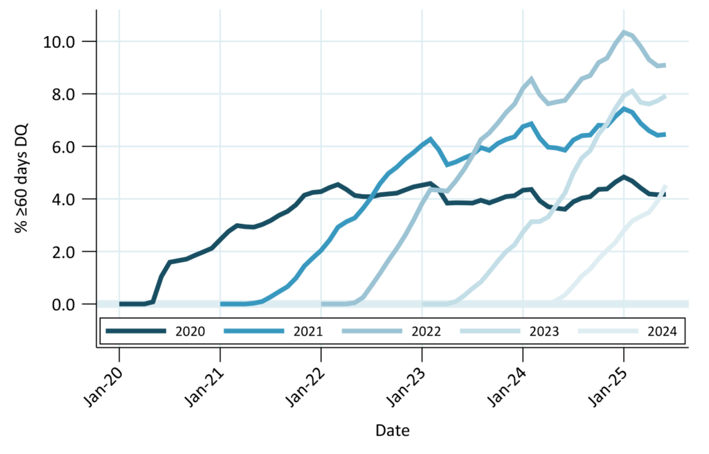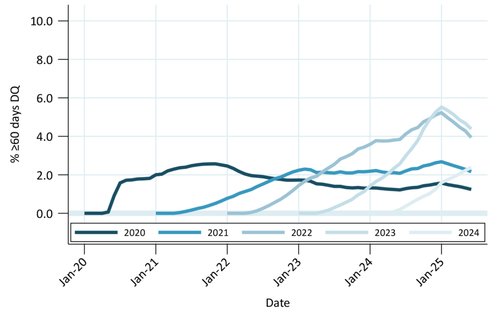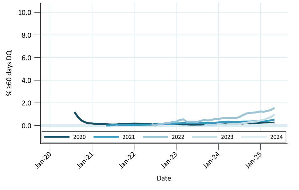 Delinquencies in some FHA vintages—before seasonal slowdown—near 10% reflecting high LTV, weak HH finances and likely student loan pay stress. Early-year seasonal improvements are ending.