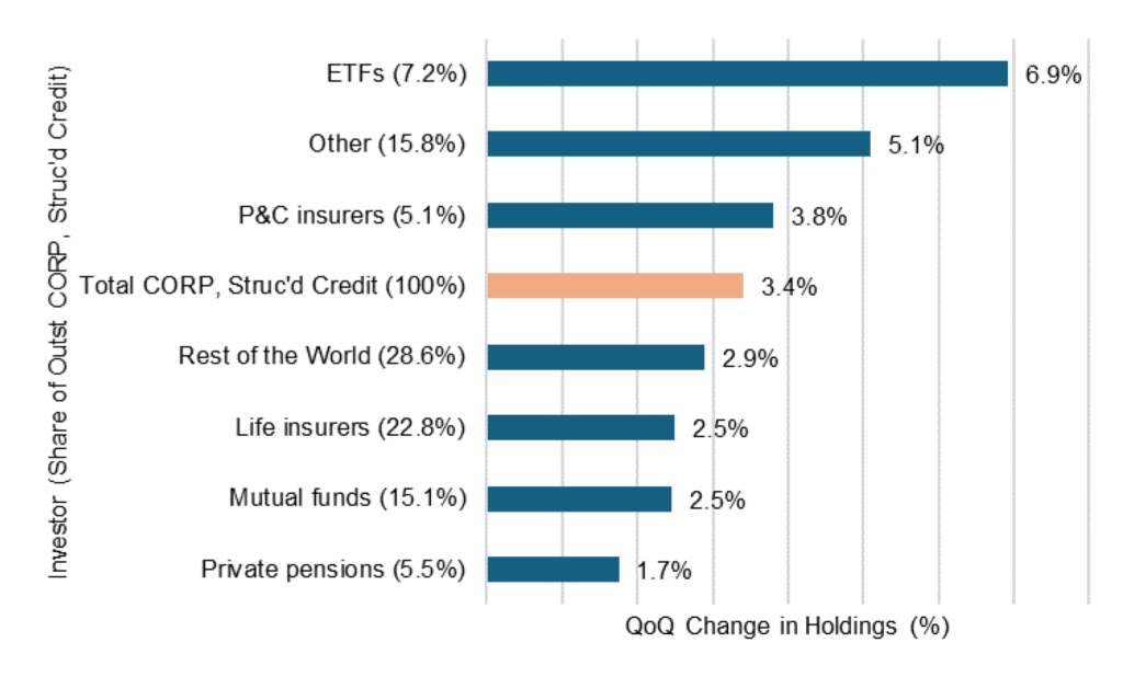 In corporate and structured credit, ETFs, a range of other smaller portfolios and P&C insurance portfolios all grew faster than the market’s overall 3.4% rate (Exhibit 4). The laggards included foreign portfolios, life insurers, mutual funds and private pensions.