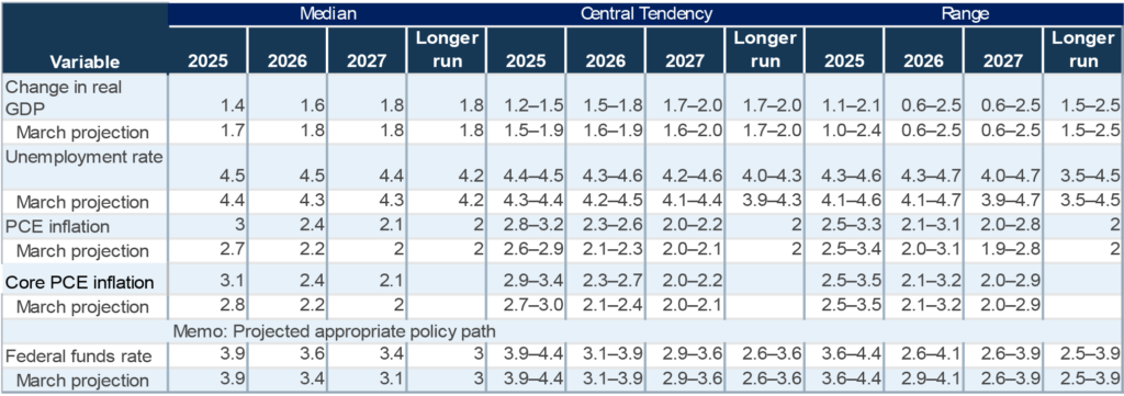 The main narrative coming out of the recent FOMC meeting was that the Fed had lowered its 2025 growth projections (the median fell from 1.7% to 1.4%), raised the unemployment rate estimate (from 4.4% to 4.5%), and bumped up inflation forecast considerably (by three tenths for both the headline and core PCE deflator). The natural conclusion, which is broadly true, is that Fed officials have downgraded their economic projections due to the news on tariffs since mid-March, when the previous forecasts were released.