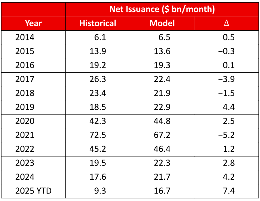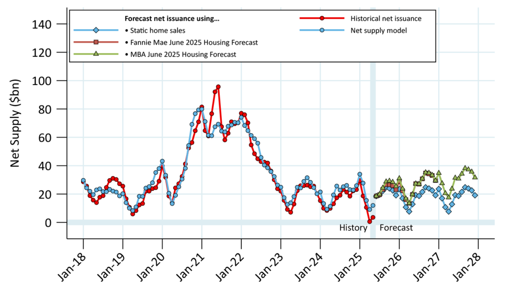If home sales follow the forecasts from Fannie Mae and the Mortgage Bankers Association then net supply should trend higher over the rest of 2025 and the following years, potentially averaging about $26 billion a month in 2026.