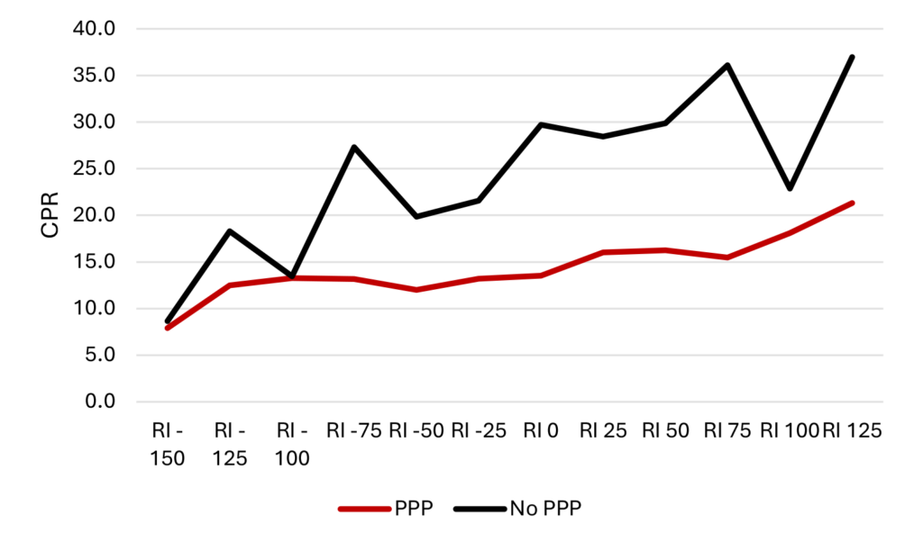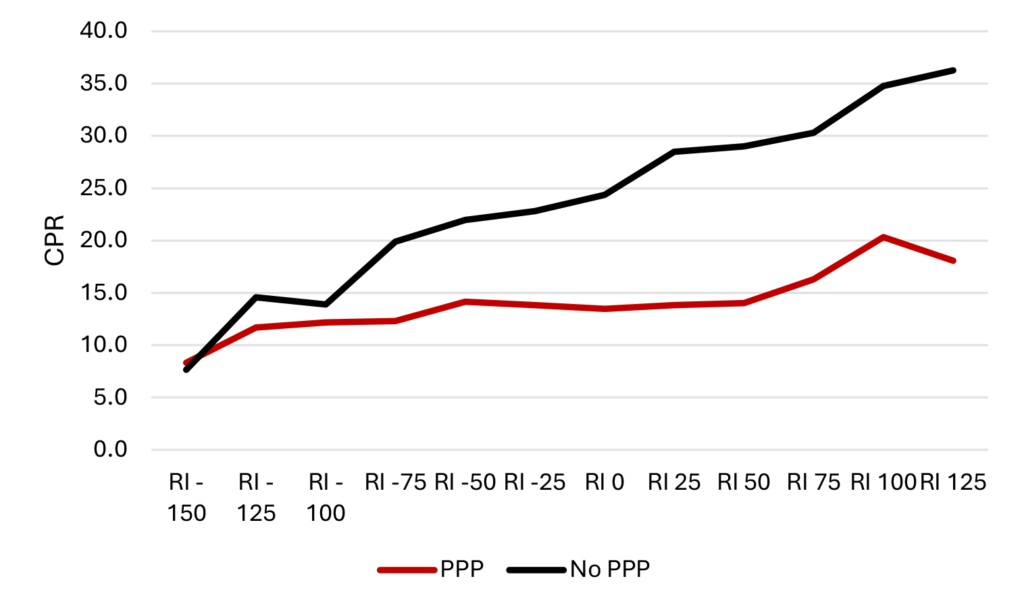 However, this simplified analysis does not account for other loan attributes within the penalty cohort that may enhance its convexity relative to the no-penalty cohort. Definitionally, the penalty cohort will be comprised solely of investor loans, which show a more muted response to refinancing incentives. The analysis will also not account for differences in loan size or other attributes that should affect response to incentive.