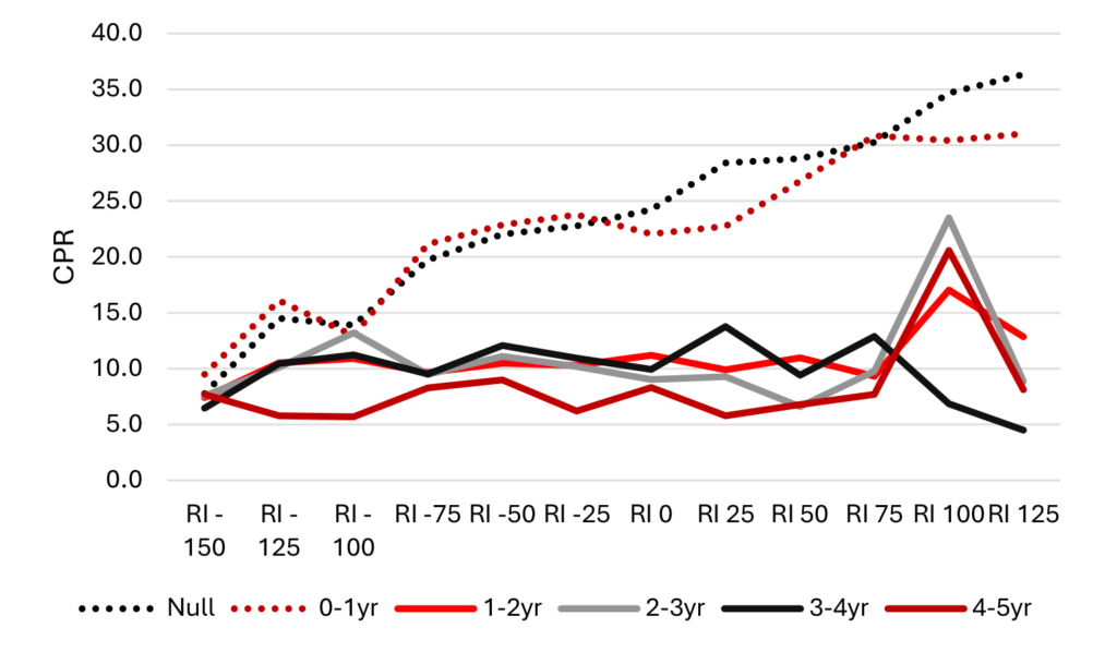 While the presence of prepayment penalties looks to have a demonstrable impact on speeds, that impact is more nuanced. Two factors, the duration of the prepayment penalty and the amount of borrower equity appear to either magnify or limit the impact of prepayment penalties. While all loans with penalties exhibit fairly flat S-curves, the presence of longer duration penalties appear to dampen in-the-money speeds more than shorter ones.