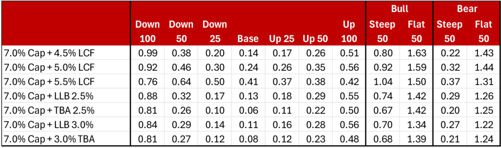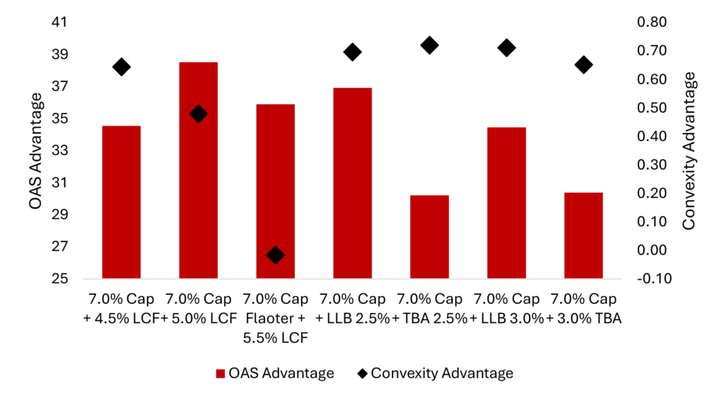 Investors in floating-rate CMOs have options when it comes to both the cap they are willing to short and the collateral backing the bond. The market currently commonly offers floater caps ranging from 6.5% to 8.0%, and bonds can be backed by more positively convex profiles like loan balance or more negatively convex TBA-like collateral. Floaters with 7.0% caps backed by more convex collateral profiles appear to strike an attractive balance of current carry and OAS while still providing protection against a further rise in rates and steepening of the yield curve.