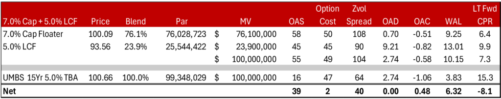 Constructing the barbell requires solving for a blend of floaters and last cash flow bonds that will be both duration and market value proceeds neutral to an exposure to 15-year 5.0% TBA. Targeting an invested market value of $100 million with a net duration of 2.74 years, equivalent to the effective duration of UMBS 15-year 5.0% TBA, would imply a $76.1 million floater investment paired with a $23.9 million investment in a 5.0% CMO last cash flow bond. The paired trade offers substantially more nominal spread, comparable option cost and better convexity than the investment in the 15-year pass through (Exhibit 1).