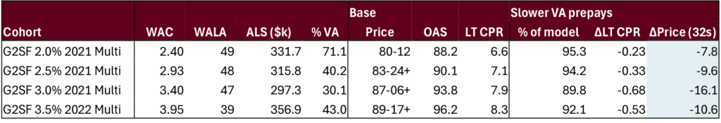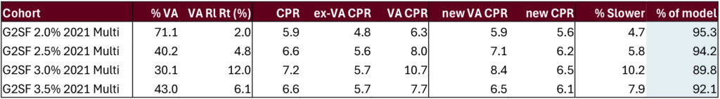 Each cohort’s speed is recalculated assuming the ongoing prepayment speed from new VA delinquencies were 19.9% slower than it was. Performance from January 2023 through June 2025 for G2SF 2% through 3.5% multiple issue pools.