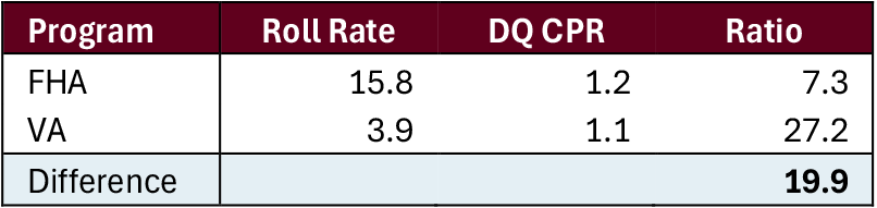 Over the long run, the pace of delinquent loan prepayments is driven by how fast loans become delinquent and how likely those loans are to prepay. At one extreme, if no loans become delinquent then these prepayments would be zero. At the other extreme, if all loans prepay as soon as they default then the prepayment speed increase would equal the annualized roll rate. Understanding the roll rate and the likelihood at which a loan prepays once delinquent is key to understanding this change.