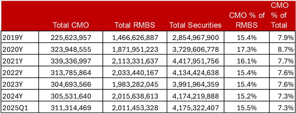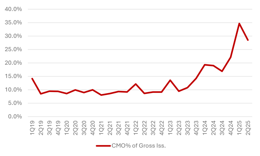 CMOs subsequently have made up a smaller share of bank investment portfolios, holding fairly steady at roughly 15% of total MBS holdings and just over 7% of total securities. Admittedly, the bank holdings data is lagged, and we may have a clearer picture of more meaningful bank demand once the second quarter 2025 data is available. However, a meaningful uptick in bank demand for CMOs would go against a multiple-year trend of a weakened appetite for the product.