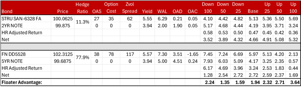 Note: 2yr and 5yr duration hedges are expressed as absolute returns. HR adjusted return expresses the hedge return in each scenario times the duration neutral hedge ratio. Net returns are calculated as the asset return less the HR adjusted return. Floater advantage is the hedged floater returns less the hedged fixed rate specified pool return.