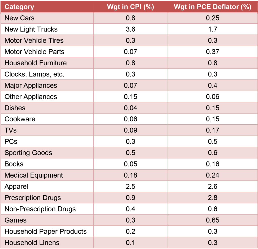 Admittedly, there is a certain amount of interpretation here, but I have singled out 21 items from the price aggregates that I believe include a significant amount of imported goods and are consequently likely to be affected by tariff hikes (Exhibit 1). If anything, an exhaustive list would likely be much longer. In any case, the highlights are motor vehicles and parts, apparel, and a variety of household goods. It is important to highlight each line item’s 2024 weight in the CPI and in the PCE deflator. For example, new cars represent 0.80% of the CPI and 0.25% of the PCE deflator.