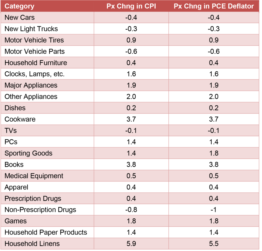 In fact, for most goods items, the CPI price changes in a given month translates directly to the PCE deflator (Exhibit 2). In a few cases, the readings are slightly different, mainly because the translation in some instances occurs at an even lower level of aggregation than I use. For example, I look at apparel as a whole, but the CPI price changes pass through to the PCE deflator at a more detailed level, such as men’s apparel, women’s apparel and so on.