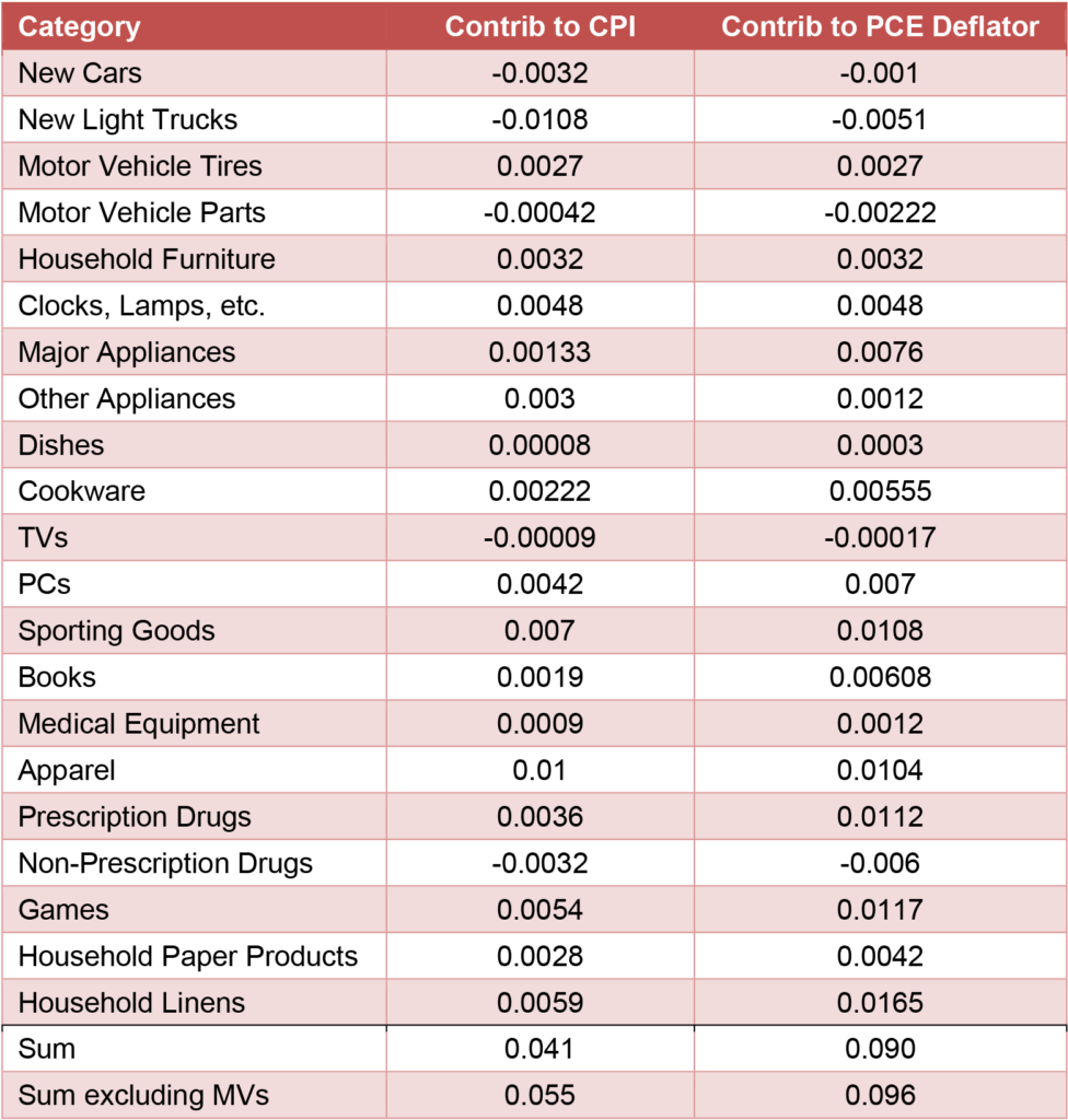 The first key insight from this exercise is that this subset of line items carries a larger weight in the PCE deflator than in the CPI. The sum of the 21 weights add up to 11.7% for the CPI and 13.4% for the PCE deflator. Moreover, if we excludes new cars and light trucks, which seem to be a special case, the corresponding weights are even more different, 7.3% for the CPI and 11.5% for the PCE deflator. This means that if the price changes for the line items are roughly equal between the two different inflation measures, the impact from tariffs on the PCE deflator will be larger than for the CPI.