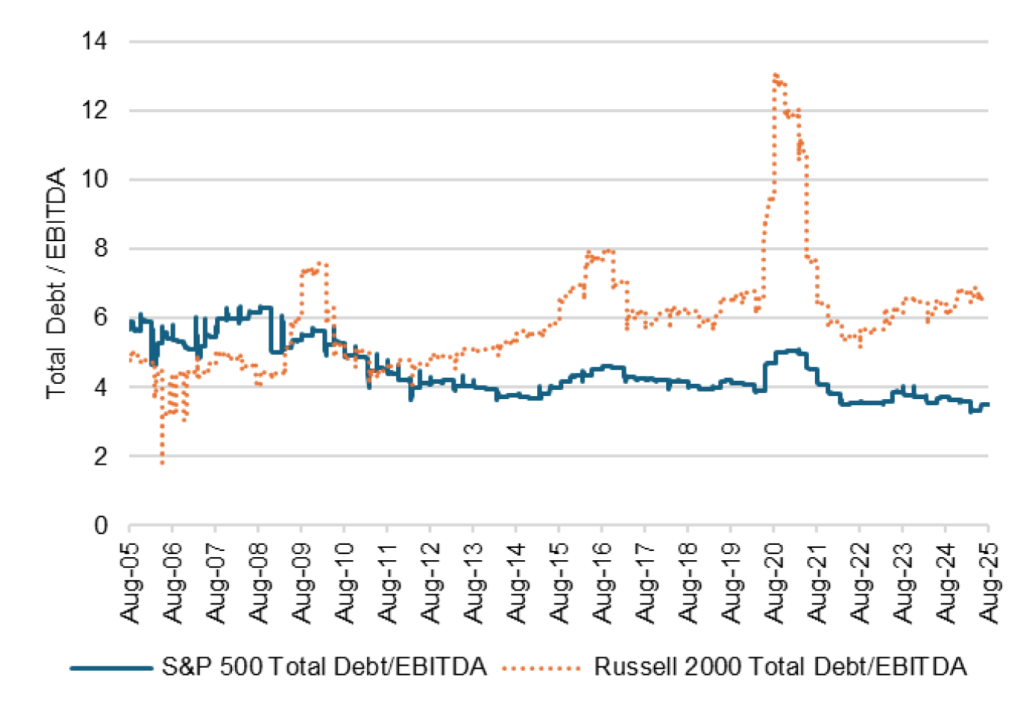 Differences in earnings not surprisingly have contributed to differences in balance sheet leverage. The S&P 500 names have generally deleveraged for the last 20 years while the Russell 2000 names have added leverage (Exhibit 2). The difference has widened since mid-2022 with debt-to-EBITDA in the S&P 500 down 2% and in the Russell 2000 up 28%.