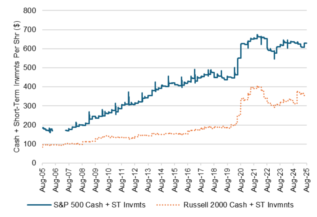 Balance sheet liquidity in the form of cash or short-term securities per share differed more before Covid than after. Companies in the S&P 500 built liquidity much faster than in the Russell 2000 until Covid and then the smaller companies closed the gap (Exhibit 3). From roughly 2014 through 2018, larger companies held more than 2.5 times the liquidity per share as smaller. But in 2020 that declined to less than 2 times and the proportional gap has remained there or dropped further since. Large companies still have more liquidity than small.