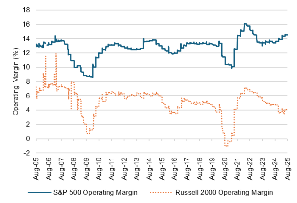 Operating margins have also headed in opposite directions. Margins at large and small companies roughly tracked each other before 2022 with smaller companies lagging slightly (Exhibit 4). In mid-2022 again, something happened. Margins at large companies initially declined before rebounding in the last year while margins at small companies declined and kept on going. Since mid-2022, margins at S&P 500 companies are down 8%, at Russell 2000 companies down 40%.