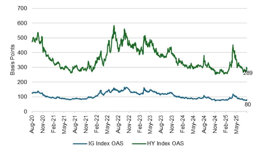 A wide range of specific industries and individual companies still have exposure to tariff risk, but fundamentals for the average of the distribution continue to look stable. Most investment grade corporate and most consumer balance sheets have fixed-rate funding so falling rates have limited immediate effect. Consumer debt service coverage is roughly at 2019 levels. However, serious delinquencies in FHA mortgages and in credit cards held by consumers with the lowest credit scores have been accelerating. Consumers in the lowest tier of income look vulnerable, and renewed student payments and cuts to government programs should keep the pressure on. The balance sheets of smaller companies show signs of rising leverage and lower operating margins. Leveraged loans also are showing signs of stress, with the combination of payment defaults and liability management exercises, or LMEs, often pursued instead of bankruptcy, back to 2020 post-Covid peaks. If the Fed only eases slowly this year, fewer leveraged companies will be able to outrun interest rates, and signs of stress should increase. LMEs are very opaque transactions, so a material increase could make important parts of the leveraged loan market hard to evaluate.