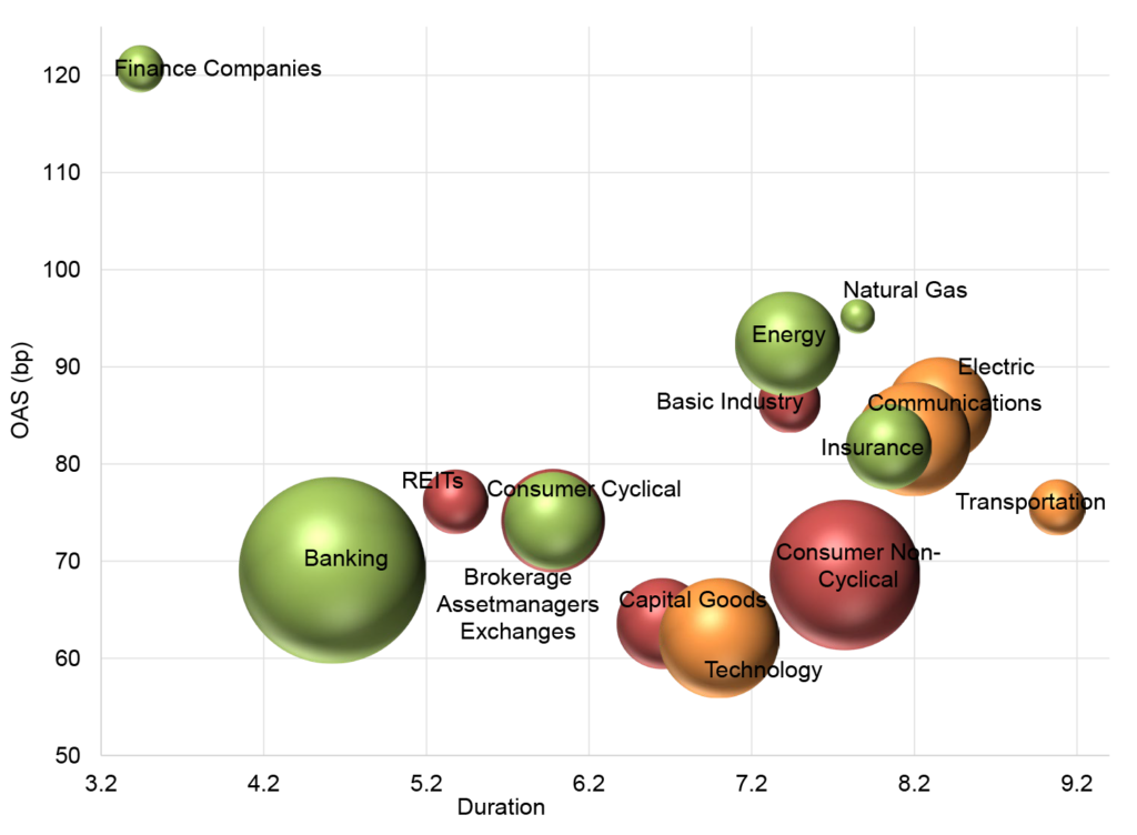 Source:Santander US Capital Markets LLC, Bloomberg/Barclays US Corp Index. Color = recommendation: Green – stronger relative value, Red – weaker relative value, Yellow – neutral relative value. Size = Market Value within the IG Index