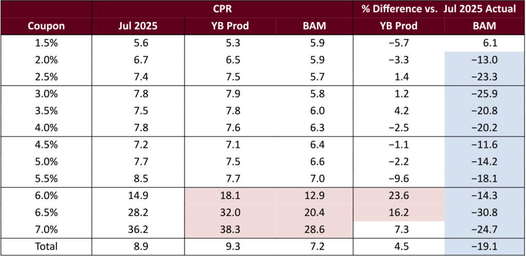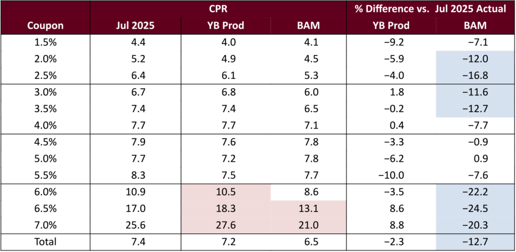 Yield Book’s latest production prepayment model, v25.1, was reasonably accurate in July (Exhibit 2). The model was still too slow on cuspy coupons, although by a much narrower margin than the predecessor model. It was somewhat fast on 6.5%s and 7.0%s. But the error on most coupons was within 10%. Bloomberg’s model continues to run too slowly; a major contributor is the model’s mortgage rate projection is too high.