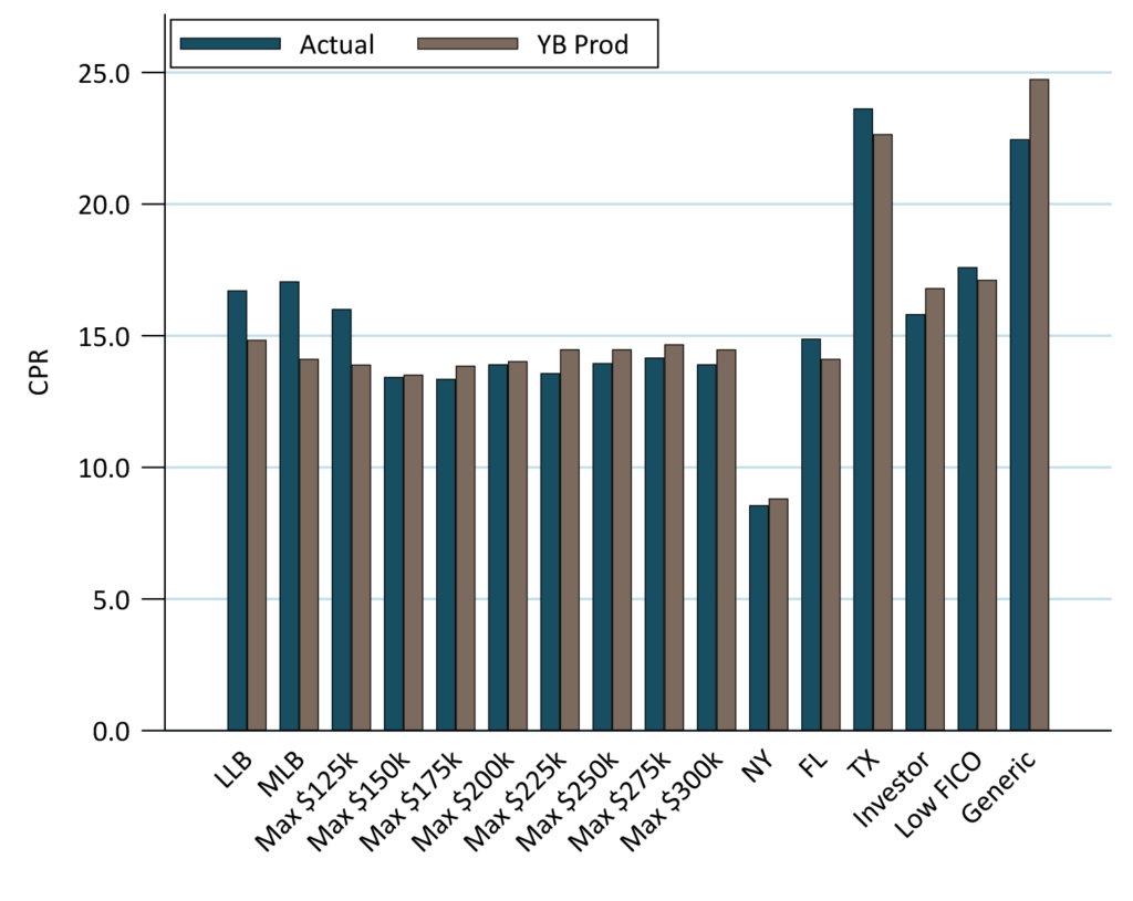 The picture was similar in 7.0%s 2024 (Exhibit 5). Generic speeds exceeded 32 CPR. This coupon is smaller, so a few spec pool categories are not shown (these are too small for Bloomberg’s MBS index). Investor and low FICO pools prepaid faster than low loan balance, showing that loan balance pools retain their prepayment protection deeper in-the-money. This is also true of New York. However, speeds across loan balance categories from Max $175k through Max $250k were similar, again suggesting that at these rate incentives the best value came from the larger balance buckets that are available at lower premiums over TBA.