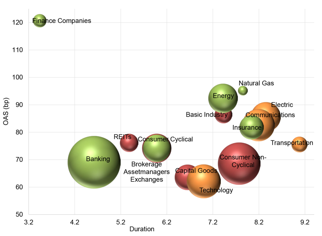 Color = recommendation: Green – stronger relative value, Red – weaker relative value, Yellow – neutral relative value. Size = Market Value within the IG Index