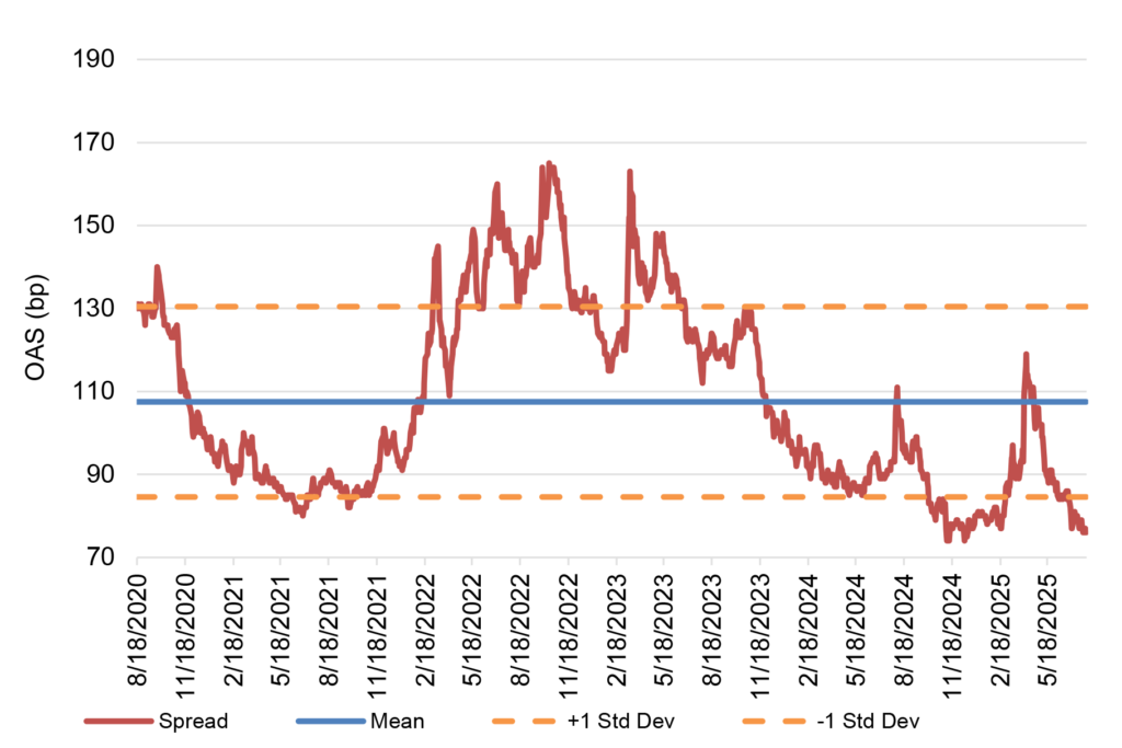 Banking and consumer cyclicals, energy and insurance look like some of the better relative value among investment grade corporates. The market delivered 56 bp of excess return in July as spreads narrowed to some of the tightest levels in years. Mutual fund inflows keep propping up demand, and upgrades continue to outpace downgrades.