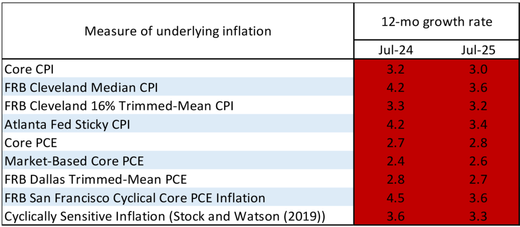 There is a long history of dovish Fed officials twisting themselves into knots parsing the price data in various ways to argue that underlying inflation is really not as bad as it appears. In 2021, there was the infamous “transitory” episode. In 2023 and 2024, several Fed officials popularized the so-called “supercore” gauge that excludes shelter costs, when rent and owners’ equivalent rent were a major contributor to core inflation. More recently, several policymakers have argued that inflation is approaching 2% after excluding the effects of tariffs. An examination of a variety of underlying inflation measures clearly indicates that it would be premature to declare victory.