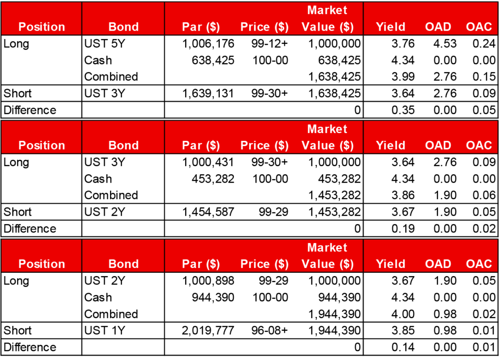Note: duration- and proceeds-neutral barbells of cash and Treasury notes against Treasury bullets. Over time, the duration of a bullet will shorten faster than the duration of a barbell, requiring rebalancing to remain duration-neutral.