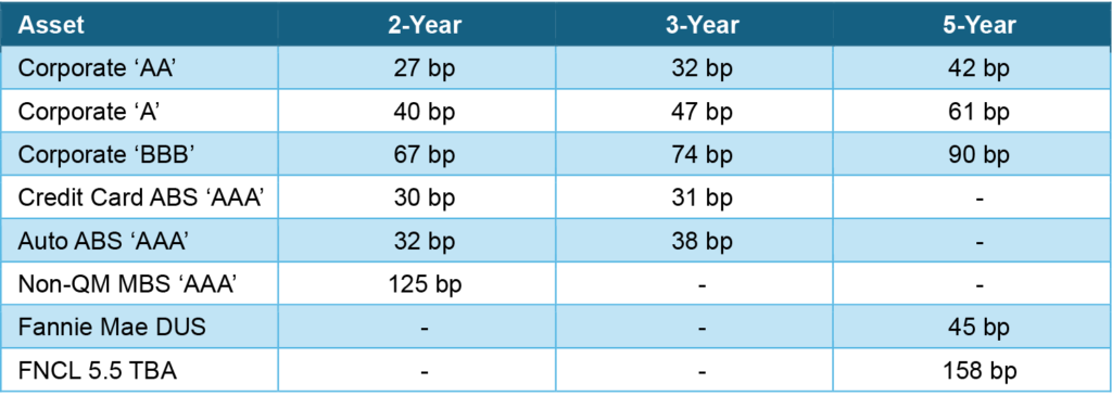 Current tight spreads in risk assets point to significant appetite for income, raising the possibility of swapping Treasury notes on the long end of a barbell for assets with similar duration but more yield and carry. For example, the average corporate ‘AA’ issue trades at a spread of 42 bp over the Treasury curve, the average ‘A’ at 61 bp and the average ‘BBB’ at 90 bp. Fannie Mae DUS, an agency credit, trades at 45 bp. And 30-year Fannie Mae TBA pass-throughs at a nominal spread of 158 bp. All of these, except arguably for the pass-through, involve giving up significant liquidity, although that could be offset by the cash side of the barbell. A barbell with cash and credit or cash and MBS would add significant income, although there’s a good case to do that with stronger credits or relatively more convex MBS.