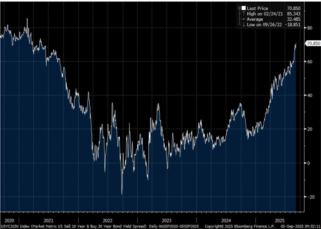 The 10s30s Treasury curve has been steadily steepening since the late months of 2024 (Exhibit 1). The recent spike beginning in late August has pushed the slope to its steepest level since May of 2021, during the tail end of the Covid pandemic. This week’s rate rally has provided little if any relief to these market pressures.