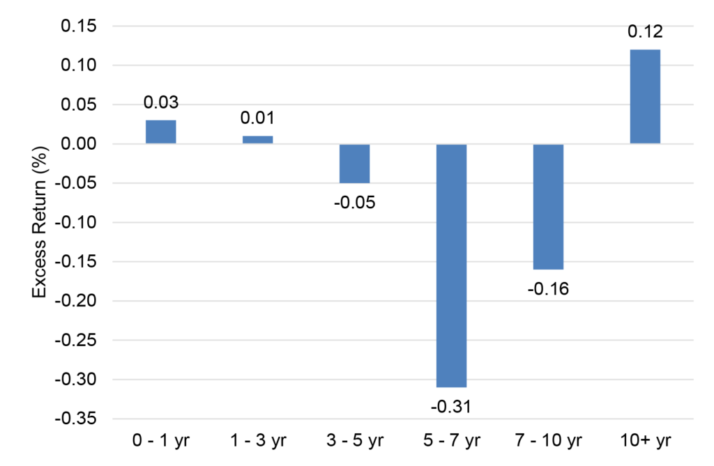 Meanwhile, in both the primary and secondary investment grade corporate bond markets, demand for 30-year paper continues unabated while intermediate maturities have struggled more under the weight of near historic tight levels for the broad market. In August, return attribution for the investment grade index demonstrated a stark contrast in performance between the long-end of the curve and intermediate maturities, as measured by monthly returns after netting out the effect of shifting rates (Exhibit 2). The 5- to 7-year maturity bucket was the single worst performance (-0.31%) in the index by duration for the month of August. Not far behind was the 7- to 10-year maturity bucket at -0.16%. While only a modest positive 0.12% excess return for 10-year and longer paper, it was still a stark contrast to shorter maturities.