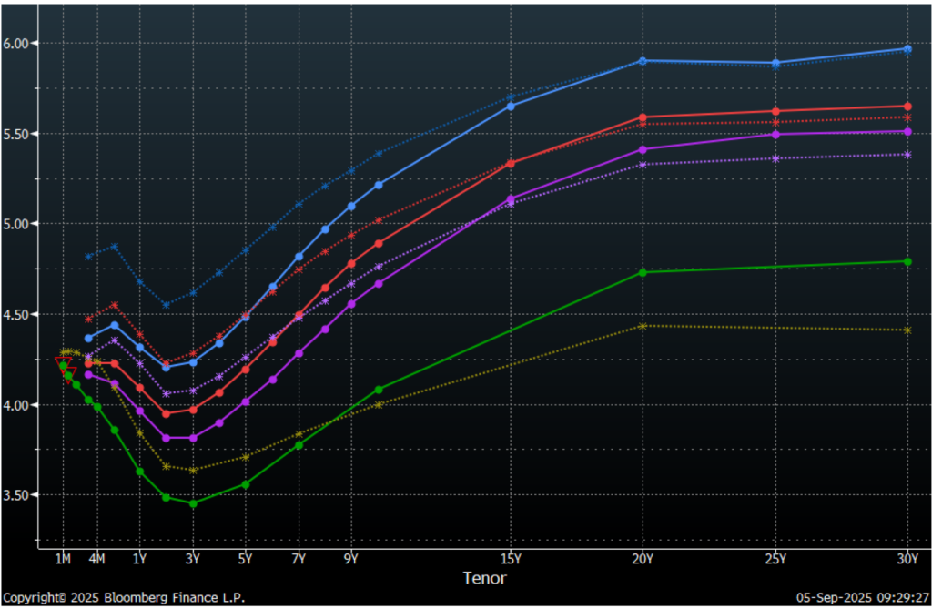It is worth noting the current relative steepness of yield curves versus the same curves at the year-to-date low for interest rates on April 4, just past Liberation Day (Exhibit 4). The solid green line presents the current yield curve for US Treasuries while the dotted green line represents the curve on April 4. The purple lines demonstrate current and past yields for ‘AA’ corporate credit. The red lines are ‘A’ corporate credit yields and the blue lines are ‘BBB’ corporate credit yields. In all four instances the long end of each curve is notably steeper in the current reading from the year-to-date nadir of US interest rates.