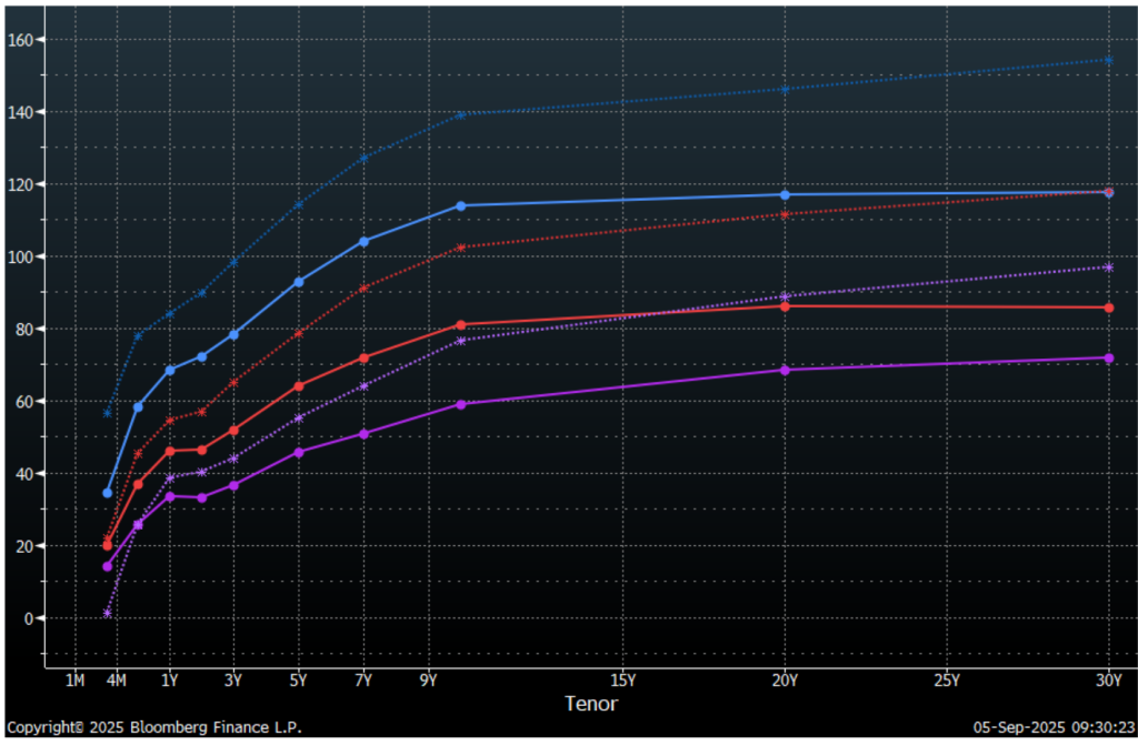 US Treasury yields have dropped nearly 20 bp over the past several sessions as investors remain focused on the prospect of Fed intervention. Still, rates had remained largely range-bound since May as tariff concerns across capital markets have become more contained. And despite the recent move lower in rates, the yield curve has steepened drastically over the past several weeks. Within investment grade corporates, this has translated to even more investor demand for long-dated paper—a trend dictating market behavior for the past several months. As a result, investment grade spread curves have become extremely flat over recent sessions, potentially giving investors a reason to pause and assess the landscape for value.