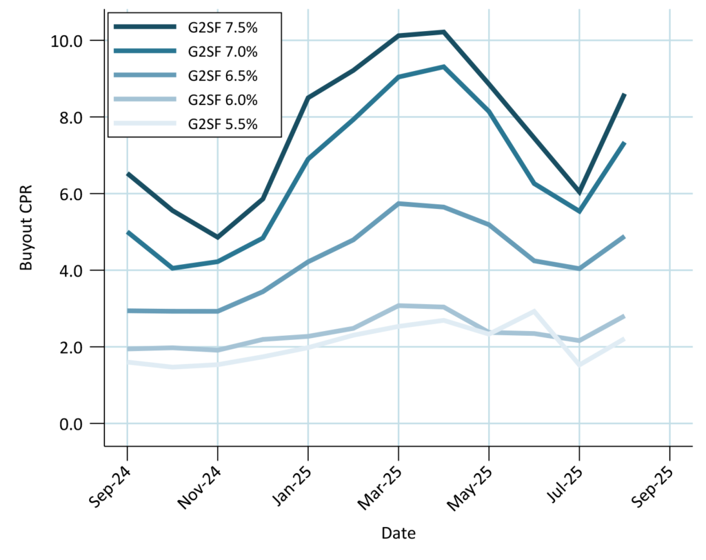 Servicers with at least $10 bn 6.0% and higher coupon G2SF 30-year MBS as of 9/1/2025. Buyout rates in those coupons from September 2024 through August 2025. 6%s and above were priced above par during this window Sorted by fastest to slowest buyout rate.