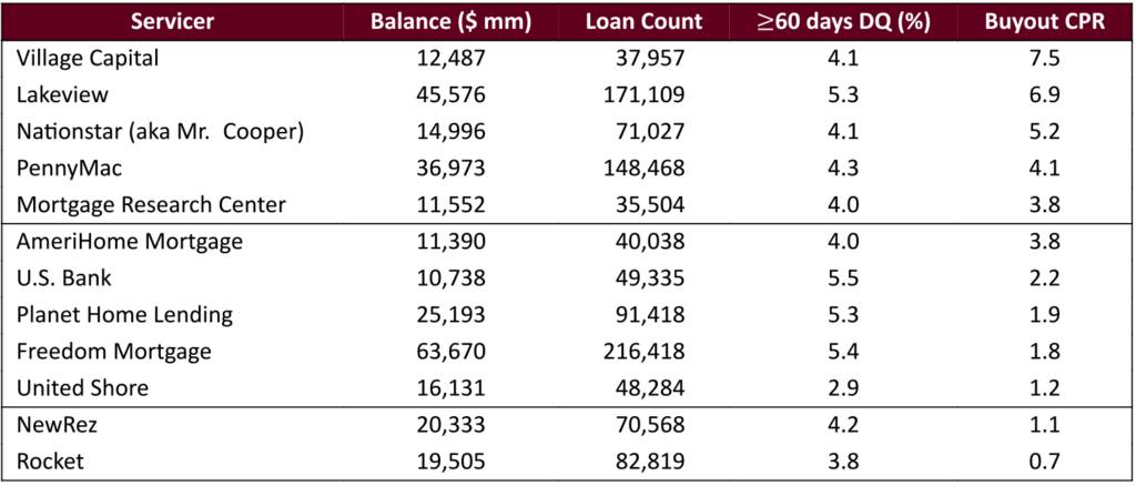 Not all servicers have been equally likely to buyout delinquent loans even if it is economical to do so (Exhibit 2). Village Capital, for example, bought out delinquent loans from 6.0% and higher coupon pools at a pace of 7.5 CPR over the last year, while Rocket only bought out loans at a 0.7 CPR average pace. Several servicers’ delinquency rates now exceed 5% in these coupons; Freedom and Lakeview are the largest of these servicers.