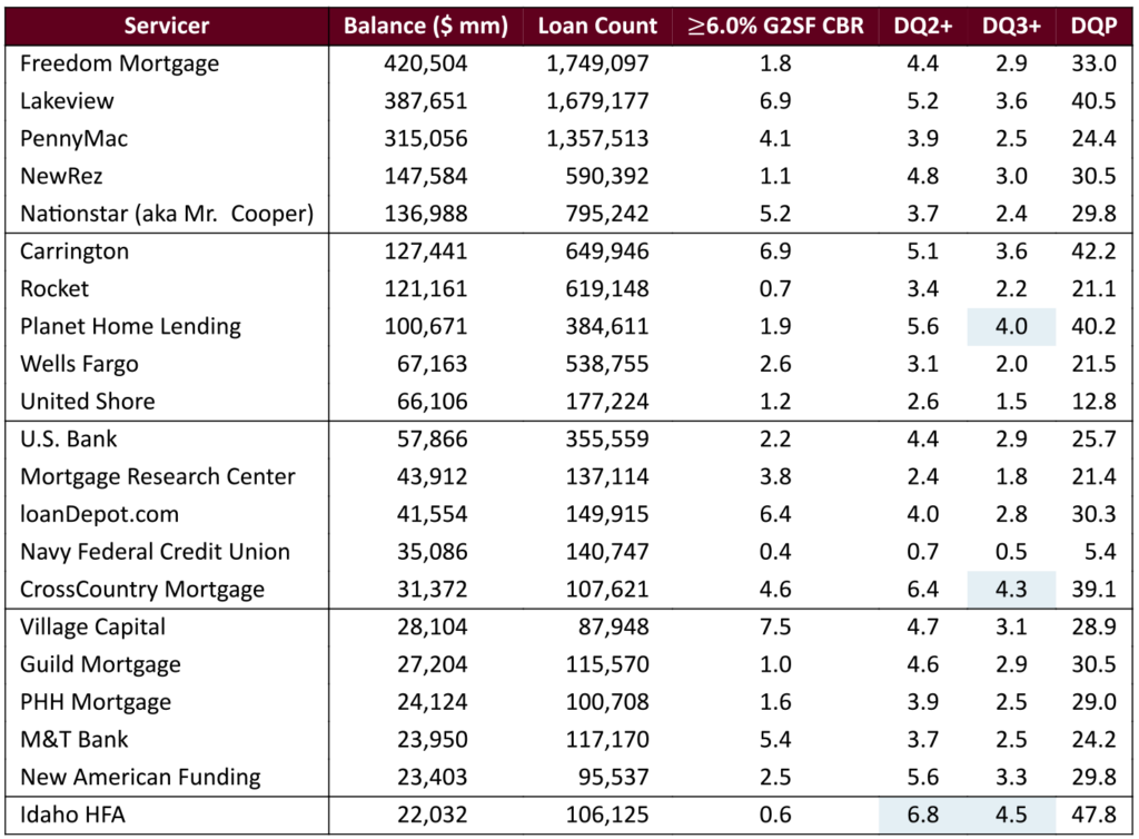 Three servicers—Planet, CrossCountry, and Idaho HFA—are within 1% of the DQ2+ and DQ3+ caps. None of the large servicers are within 10% of the DQP cap, but Idaho HFA is at 47.8%. These servicers are at the greatest risk of forced buyouts to stay compliant with the caps. CrossCountry’s buyout rate is already somewhat high, but Idaho HFA’s and Planet’s are both low relative to many peers.