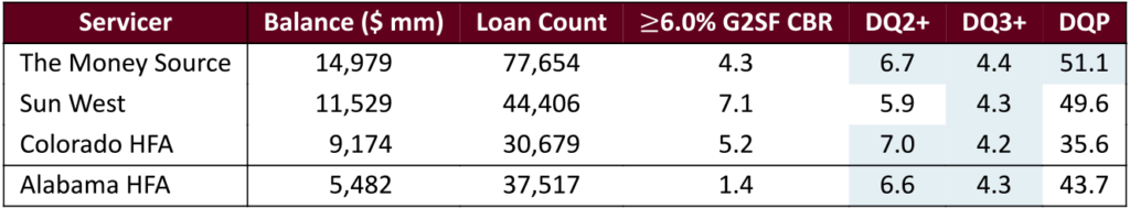 Four smaller servicers—those with at least $2 billion outstanding and smaller than Idaho HFA—are close to the delinquency caps, and a couple are over them (Exhibit 5). Money Source, for example, is approaching all three DQ limits. Alabama HFA approaching the DQ2+ and DQ3+ thresholds yet is only buying at a pace of 1.4 CBR, so likely will need to increase its buyout rate to stay compliant.