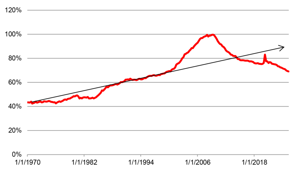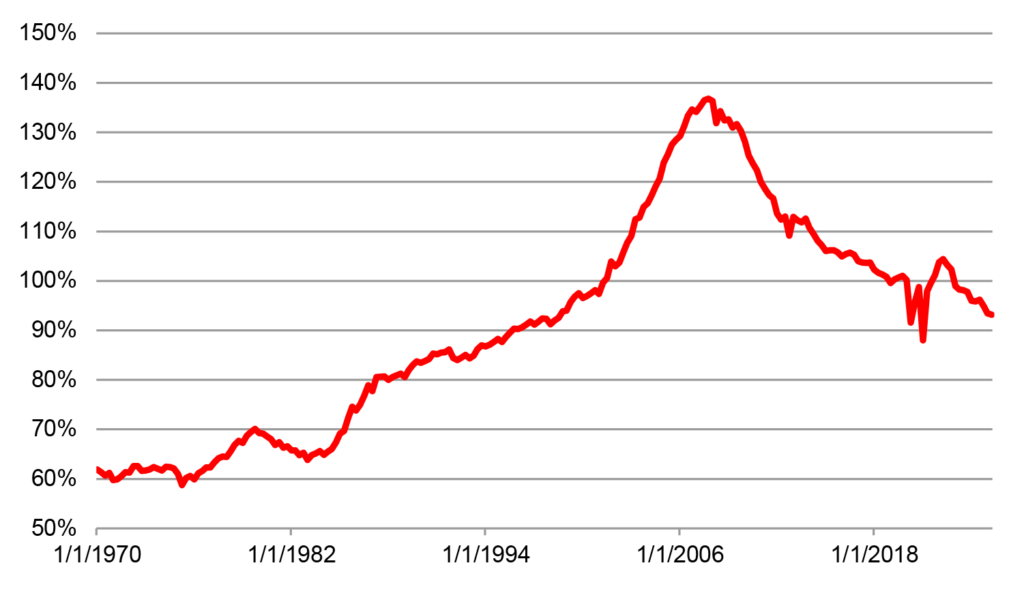 A similar way to assess the scale of household debt is to compare it to disposable income. This ratio also slid again in the second quarter, the 11th drop in the past 12 quarters and reached its lowest level since 1998, aside from some distorted readings during the pandemic (Exhibit 2).