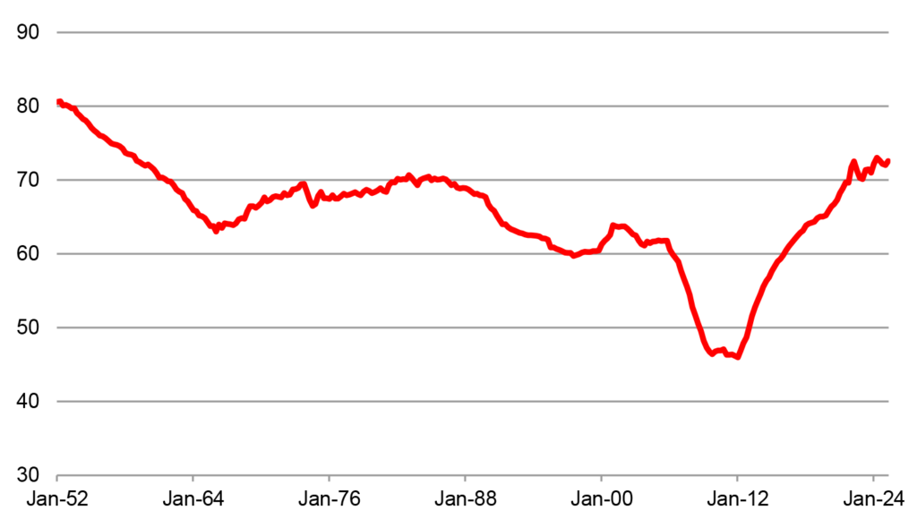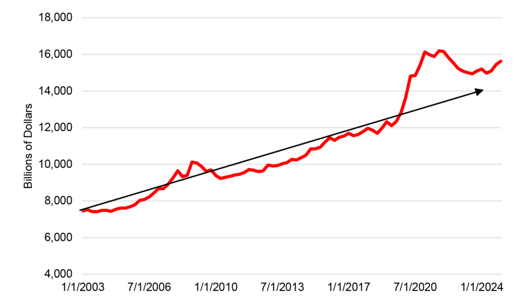 The exhibit shows that the series was most of the way back to the trend line by the middle of 2023. After that, real liquid assets resumed growth, suggesting that households viewed their cash positions as back to “normal.” Presumably, if they were sitting on elevated liquidity that they intended to spend, the series would have continued to decline.