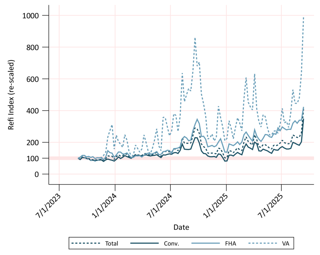 The MBA refinance index has jumped to the highest level in the last two years (Exhibit 1). Each index—conventional, FHA, VA and total—is rescaled to 100 at the start of the series. The VA index is much higher than the conventional and FHA index, reflecting the stronger refinance response of these borrowers and the lower mortgage rate these borrowers receive when refinancing.