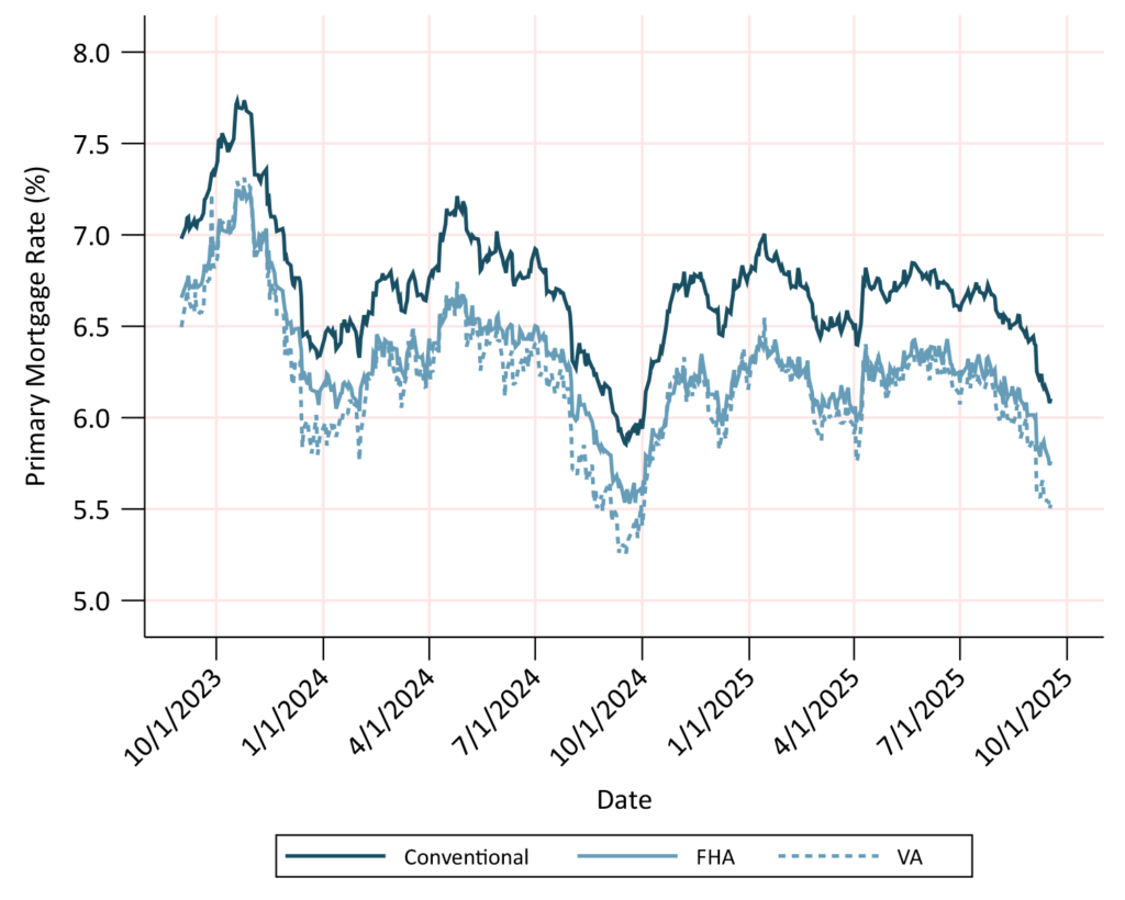 Mortgage rate calculated using rate lock data from Optimal Blue and an adjustment to calibrate to observed loan originations. Conventional rates are based off the FICO≥740, Orig LTV≤80 index.
