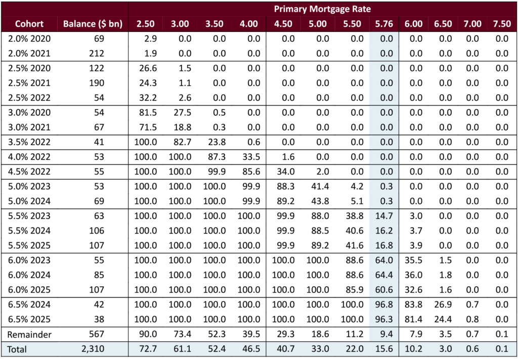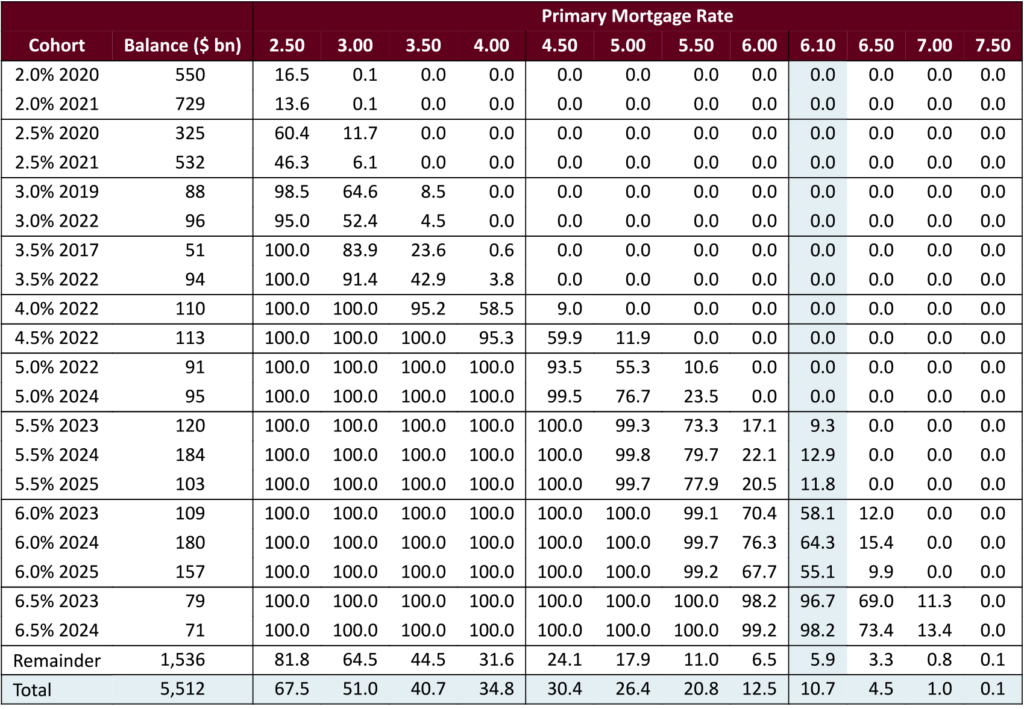 At current rates, the 5.5% cohorts are roughly 10% to 15% refinanceable (Exhibit 4). This uses a 75 bp threshold to determine moneyness, to pick out only loans that have a clear incentive to refinance. To be conservative it includes all loans regardless of seasoning. The 6%s are about half in-the-money, and higher coupons are almost fully in-the-money. Further rallies should have a much larger effect on speeds in 5.5%s and 6%s than on higher coupons.