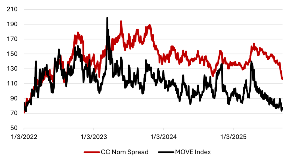 Nominal MBS current coupon spreads closed at just 116 bp within the last week, a level last seen in a pronounced albeit brief tightening in August 2022. MBS spreads had been gradually grinding tighter as they tracked the post-Liberation Day drop in rate volatility. However, the recent gap tighter is likely fueled by more than just the lowest rate volatility readings in roughly three years (Exhibit 1).