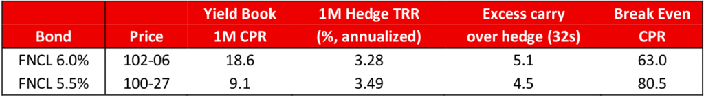 Of course, models are not always correct. Prepayments that come in faster than expected would reduce, or even eliminate, the carry advantage the MBS offers over the Treasury portfolio. Both the 5.5% and 6.0% have healthy cushions against a fast 1-month print (Exhibit 2). The FNCL 6.0% generates 5.1/32s of excess carry over its Treasury portfolio at Yield Books projected 18.9 CPR. It would take a 63.0 CPR print to eliminate that carry advantage. The FNCL 5.5% has an even larger cushion—80.5 CPR compared to the projected 9.1 CPR.